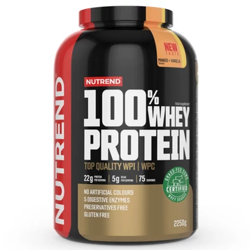A(z) NUTREND 100% Whey Protein 2250g Mango+Vanilla a Nutrend több mint 30 éves sporttáplálkozási tapasztalatára és a legújabb klinikai kutatásokra épülő formula. Célzottan a(z) Tejsavó fehérje területén elvárt optimális teljesítményt és regenerációt támogatja, szigorúan ellenőrzött, minőségi összetevőkkel. Kifejezetten tudatos sportolók számára fejlesztve, akik a kiszámíthatóságra építik a felkészülésüket.